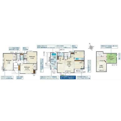 | 設備 | 床下収納 モニタ付インターホン シャッター雨戸 複層ガラス 食器洗浄乾燥機 上水道 下水道 都市ガス 電気 照明器具 火災警報器(報知機) インターネット対応 光ファイバー トイレ2ヶ所 | ||